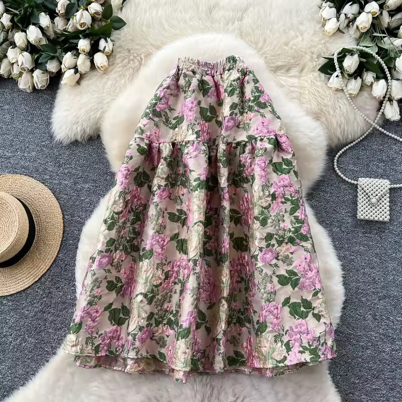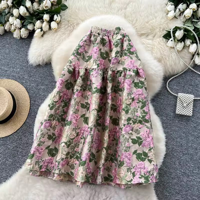 High Quality Pink & Green French Style Jacquard Pleated A-Line Skirt